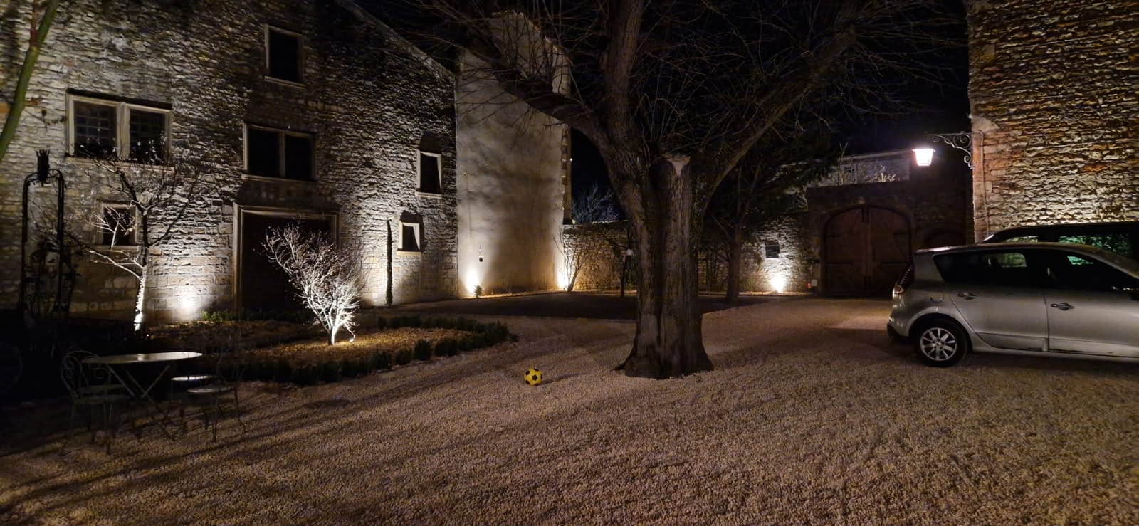 Ce chantier pour l’aménagement paysager d’une très grande cour de château en pierres dorées, dans le Beaujolais, a nécessité tout notre savoir-faire. En effet, les différents éléments architecturaux et végétaux devaient être mis en valeur de nuit, avec des éclairages savamment disposés (cf. photos), mais aussi de jour, en rendant les installations d’éclairages (spots) aussi discrètes que possible, en délimitant les différentes zones par des bordures en pierres…